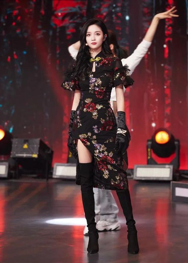 常见的旗袍侧开衩被改良成了对称两边开衩,加之超短裙的设计让辣妹气场呼之欲出