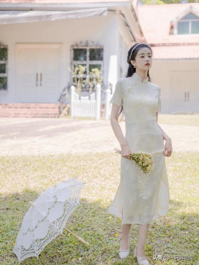 白色旗袍裙是必入款式,百搭不挑人,同时贵气满满,宛如富家千金。白色衬肤色、显白显气质,大家在搭配时,最好采用同色系穿搭,将白色的优点发挥到极致。而肤色暗沉的女性可以选择饱和度低一些的杏色和米白色,不会反光,能很好地提亮肤色。