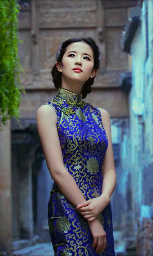 刘亦菲在某宣传片中,以一袭蓝底加金色印花的无袖旗袍出镜。虽然颜色看似过于成熟,但却中和了她眉目之间的稚嫩青涩感,凝结成一种含蓄的艳丽。